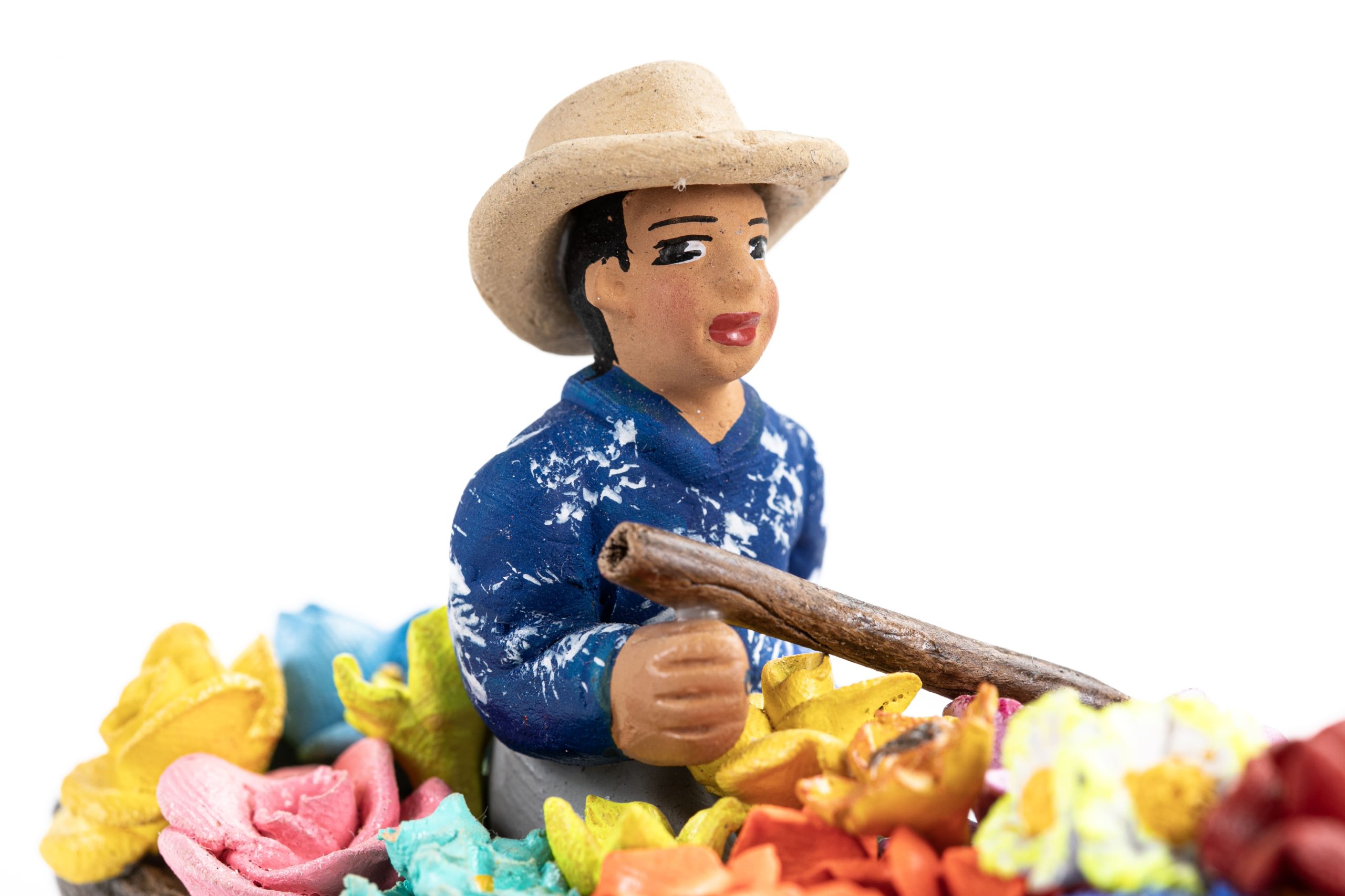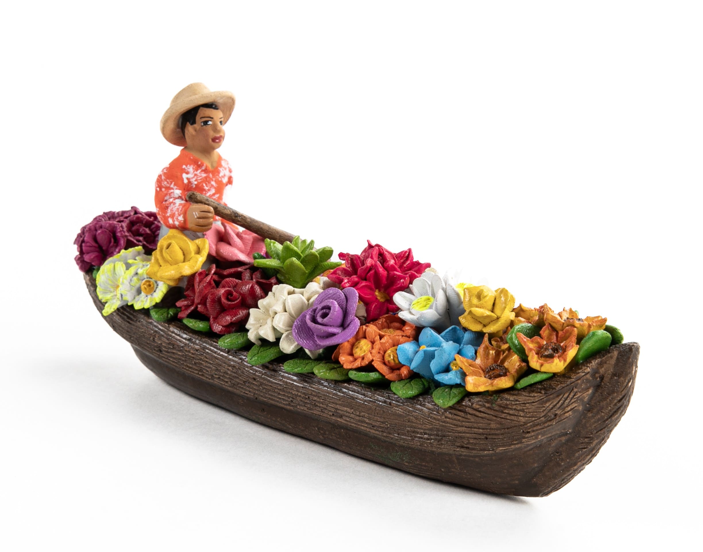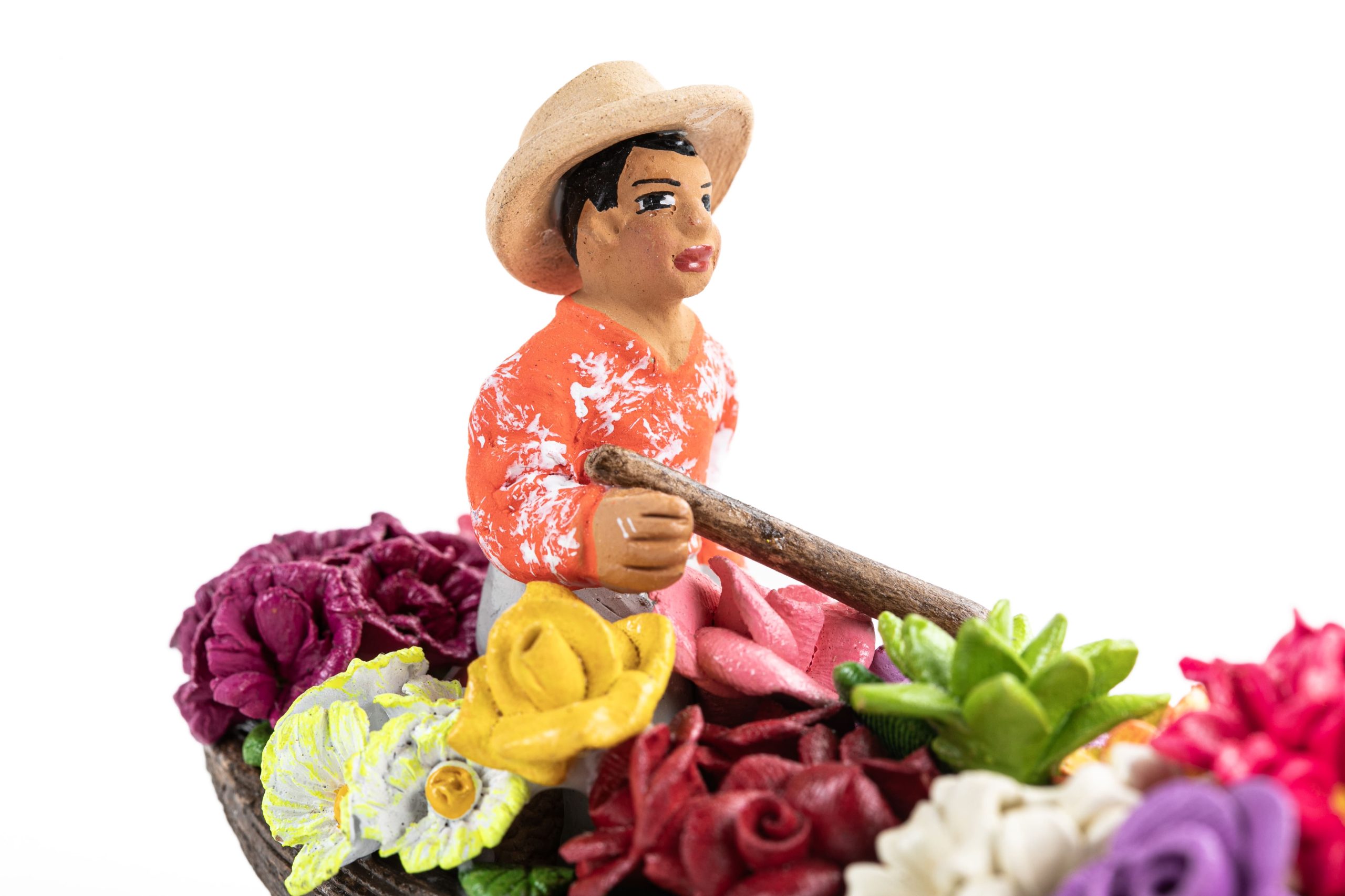 Cada canoa es única: los navegantes, vestidos con sus camisas tradicionales en tonos azul o naranja, parecen custodiar un jardín flotante. La técnica del moldeado en arcilla resalta los detalles de los pétalos y las expresiones de los personajes, convirtiendo esta artesanía en un objeto decorativo lleno de frescura, ideal para quienes buscan una pieza que transmita paz, naturaleza y el espíritu vibrante del Huila.