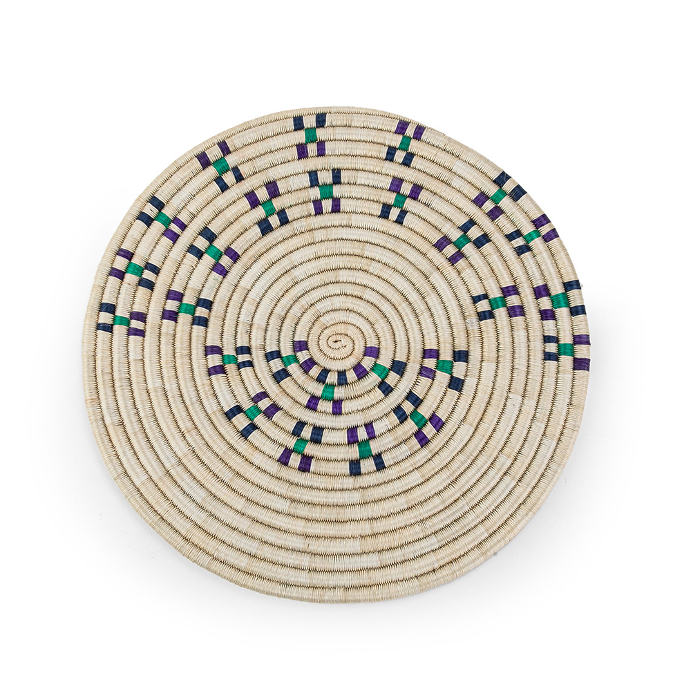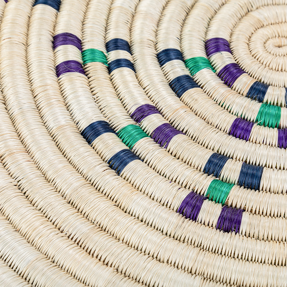 Centro de mesa elaborado en fique mediante la técnica de cestería en rollo, creado por artesanos de Guacamayas, Boyacá.