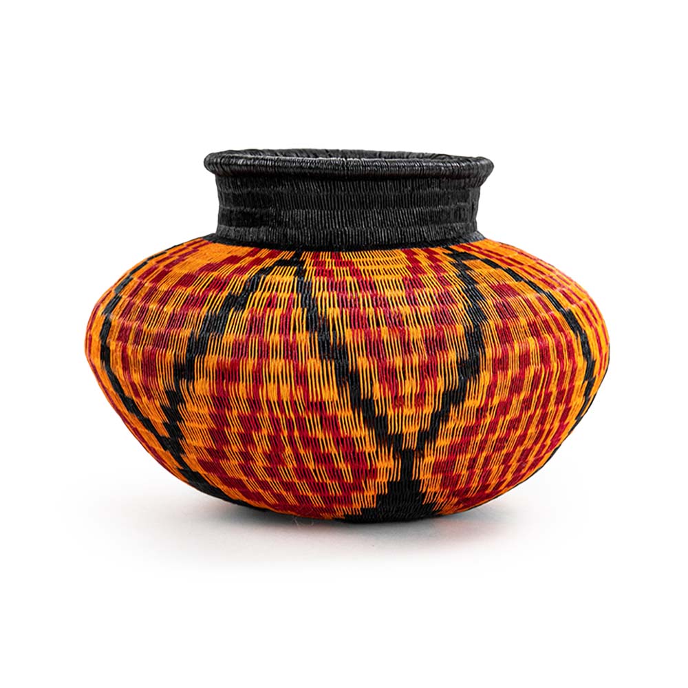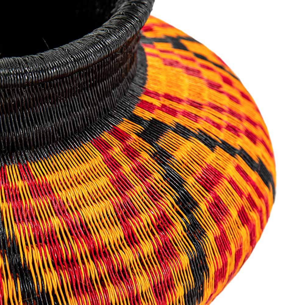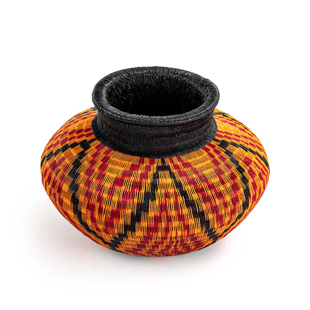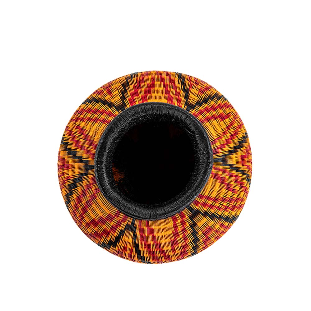 El tejido en espiral continuo, conocido como “rollo”, se entrelaza sobre una estructura central de fibra natural, creando diseños casi tridimensionales que reflejan la maestría ancestral de sus creadores. Más que un objeto, este jarrón es un lienzo de la cultura Wounaan. Sus motivos gráficos narran historias de tradiciones, creencias y la exuberante naturaleza del Chocó, transmitidas por generaciones.