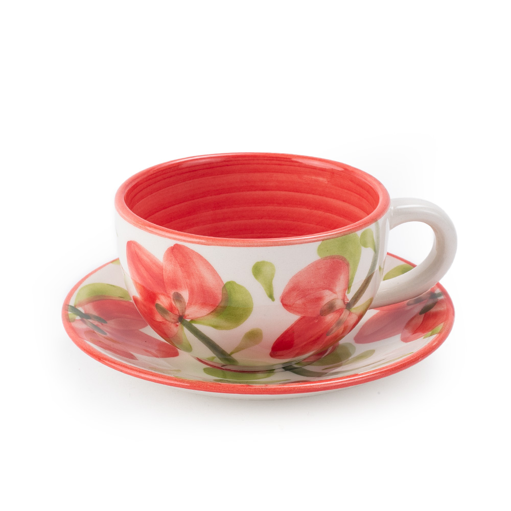 Set de plato y pocillo elaborado en la tradicional cerámica de El Carmen de Viboral, modelado, baceado, al horno y decorado a mano con pintas flores rojo carmesì y hojas verdes. ¡La combinación ideal para compartir momentos especiales con quienes más quieres!