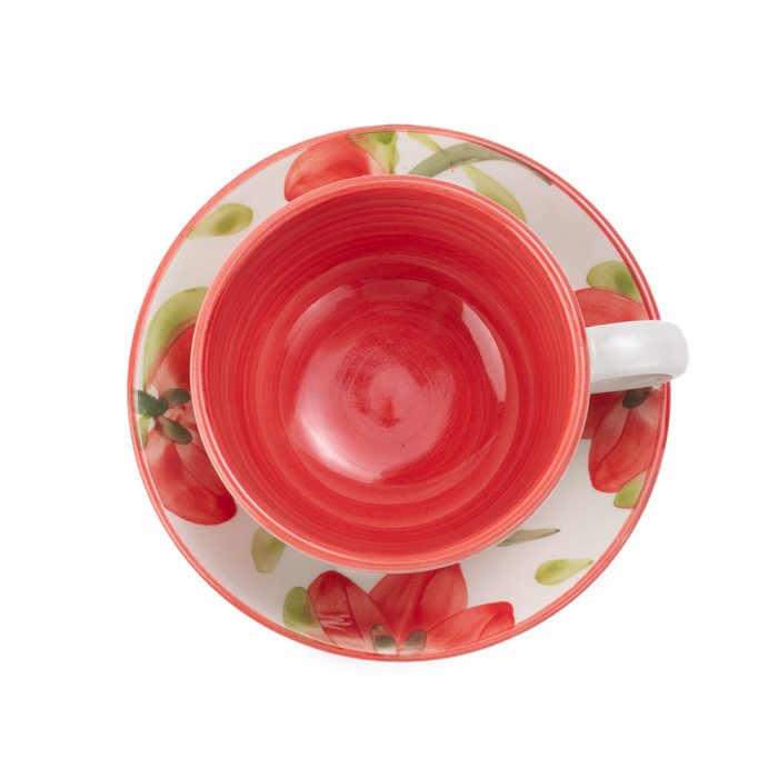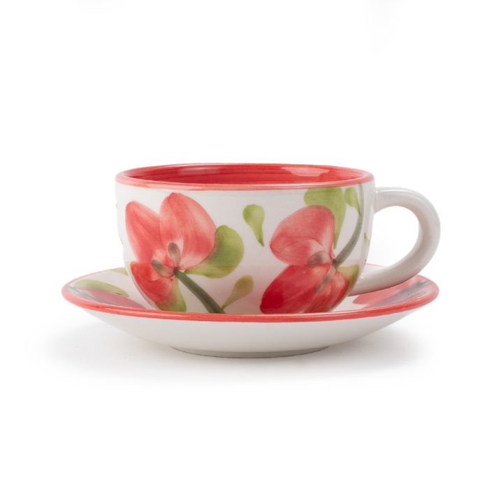 Set de plato dulcero y pocillo elaborado en la tradicional cerámica de El Carmen de Viboral, modelado, baceado, quemado al horno y decorado a mano con pinceles, aplicando pintas de flores carmesí.