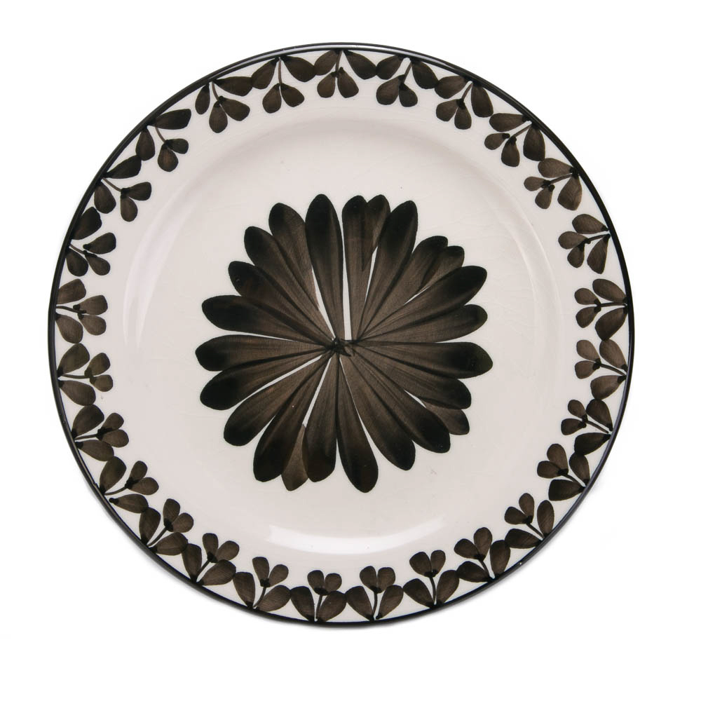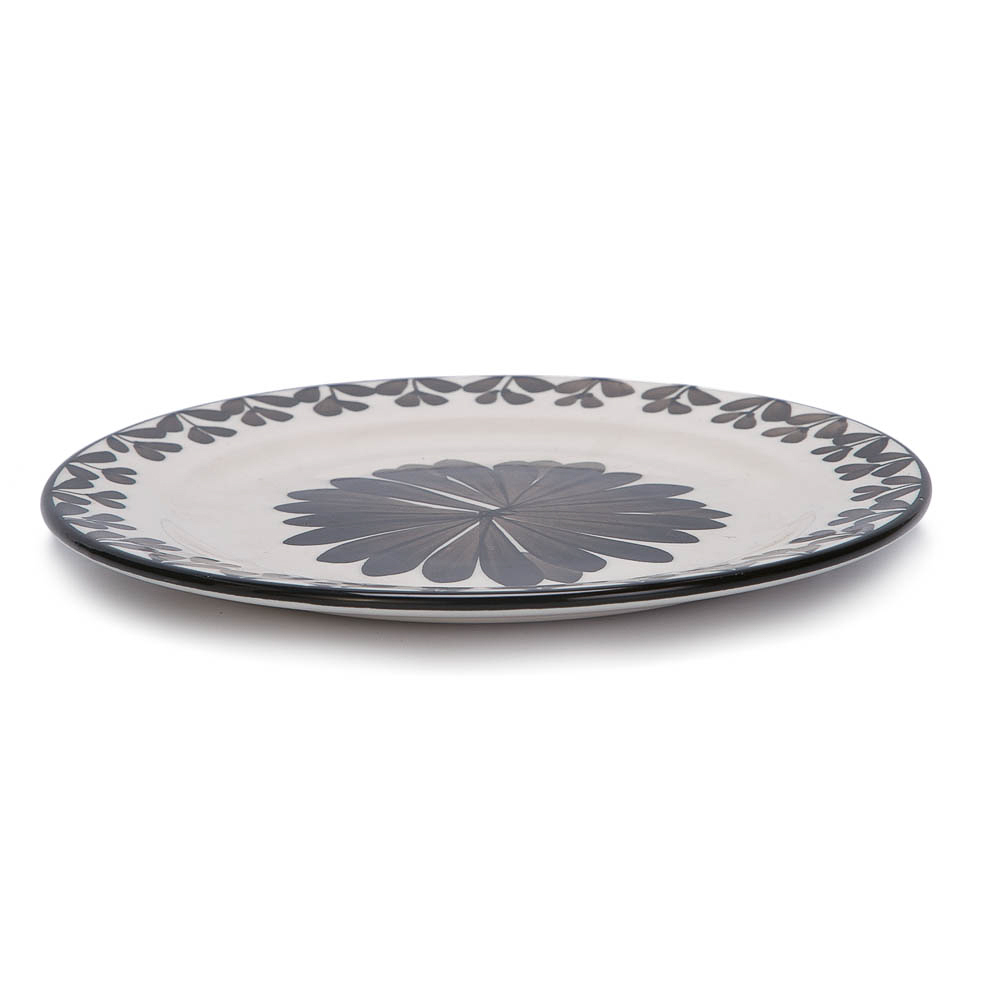 Este plato es una pieza de diseño artesanal que combina la calidez de la cerámica modelada a mano con un acabado contemporáneo y sofisticado. Su superficie, de un blanco puro y brillante, sirve como lienzo para delicados trazos en color negro que dibujan hojas y flores, creando un contraste minimalista y elegante. El acabado esmaltado no solo realza la belleza de la pieza, sino que le otorga una suavidad al tacto y una durabilidad ideal para el uso cotidiano o como un elemento decorativo de acento en la mesa. Es una obra que captura la esencia de la naturaleza con una estética moderna y limpia.